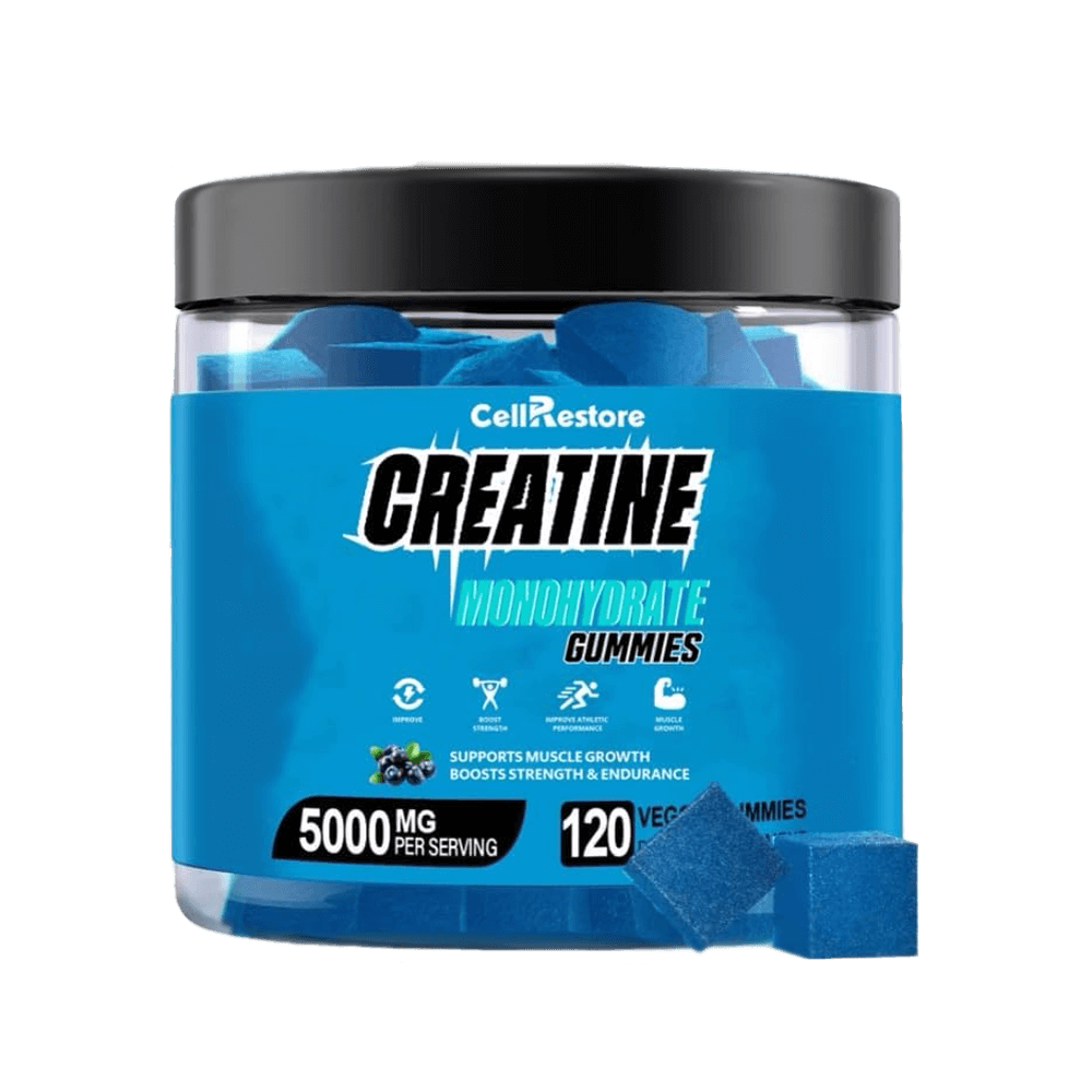 Introducing CELL RESTORE CREATINE MONOHYDRATE GUMMIES in Blue Raspberry flavor! Elevate your fitness journey with these vegan, gelatin-free, and sugar-free gummies that come in a convenient bottle of 120 pieces. Each serving of 4 gummies packs a powerful punch of 5000 mg of creatine monohydrate, making it a precise and delicious way to supplement your workouts.