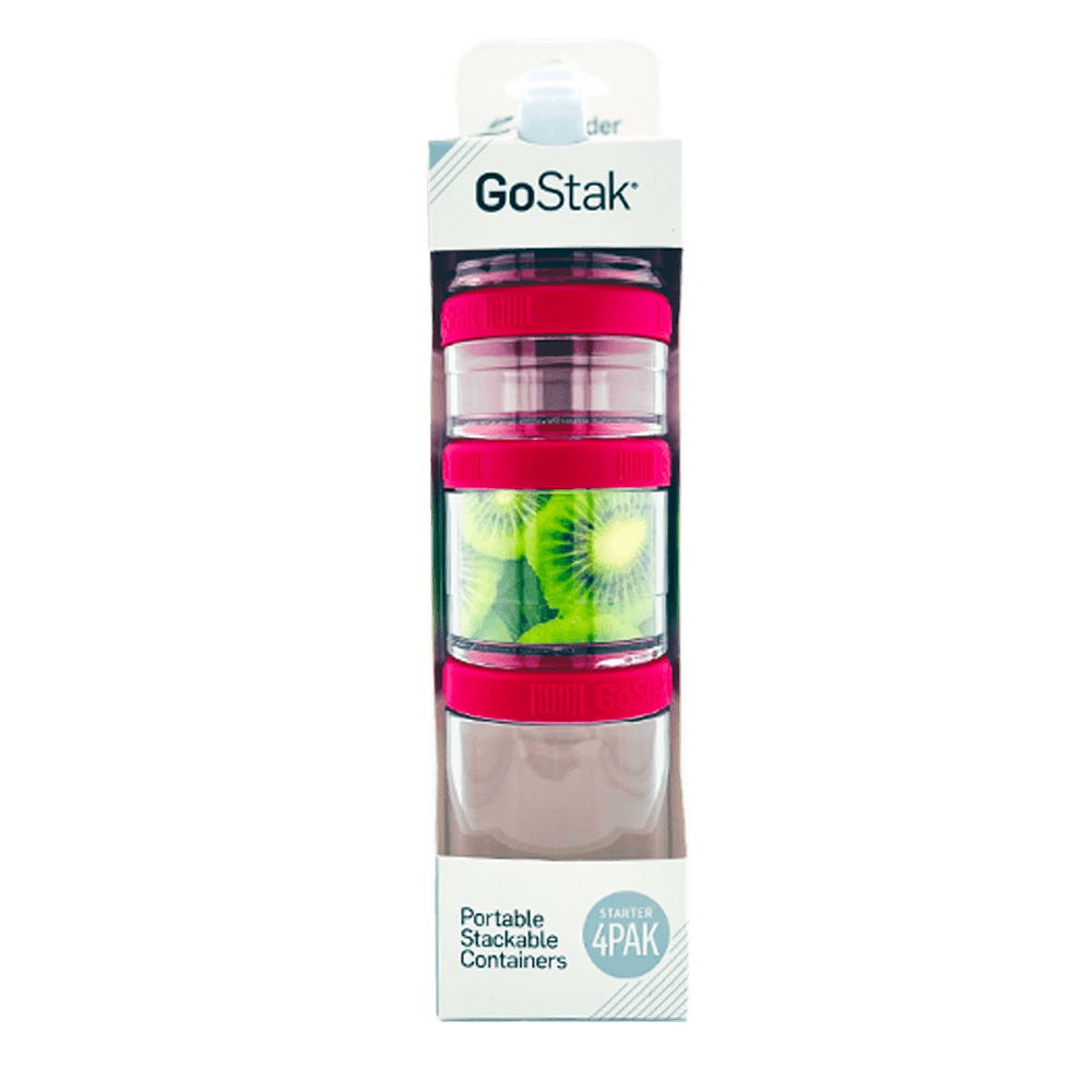 The BlenderBottle GoStak Twist n’ Lock Storage Jars 4-Piece Starter Pak includes four stackable, interlocking containers—(1) 40cc jar, (1) 60cc jar, (1) 100cc jar, and (1) 150cc jar—for carrying powders, vitamins, supplements and snacks. Portable and travel-friendly, these sleek jars are designed to carry nutritional essentials, without taking up a lot of space. Made of durable Eastman Tritan plastic, GoStak jars are stain and odor-resistant, and remain clean, clear, and fresh. BPA and phthalate-free; dishwasher and freezer safe.